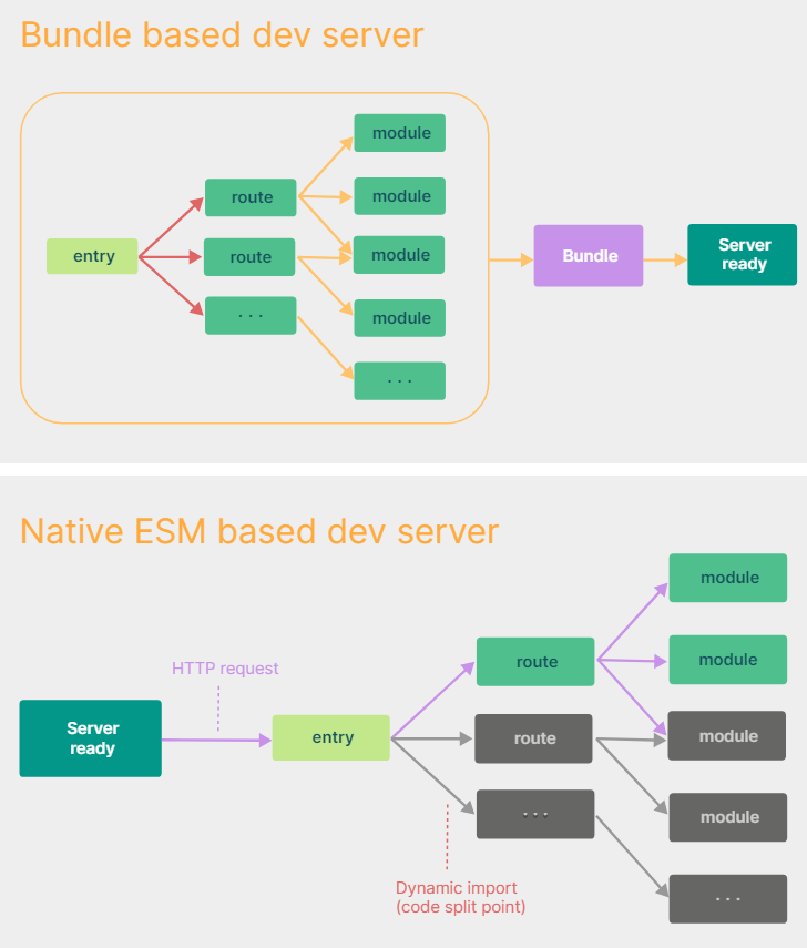 *HMR 기능을 제공하는 Vite 이외 기타 Tools에도 활용할 수도 있지만 프로젝트가 커짐에 따라 지연시간이 증가하는 문제가 있습니다. 하지만 Vite에서는 Native ESM을 활용해 프로젝트 사이즈에 영향을 받지 않습니다.