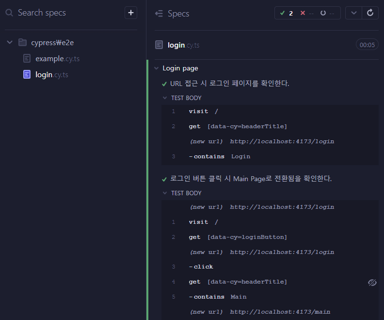 저는 로그인 버튼을 클릭 시 POST /auth 라는 api요청을 보낸 후 Main Page로 전환되는 것을 확인하는 테스트 코트를 작성 하였습니다.
