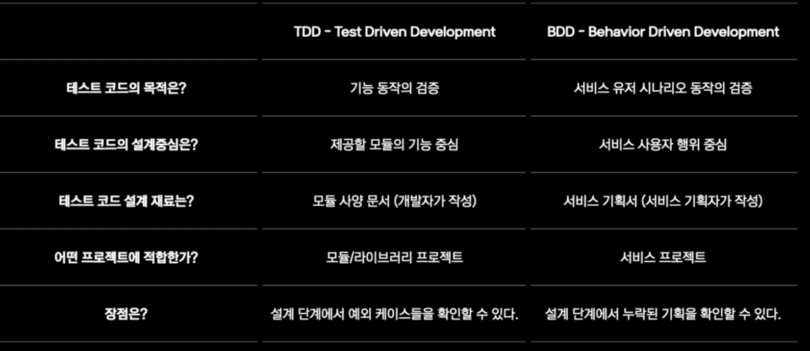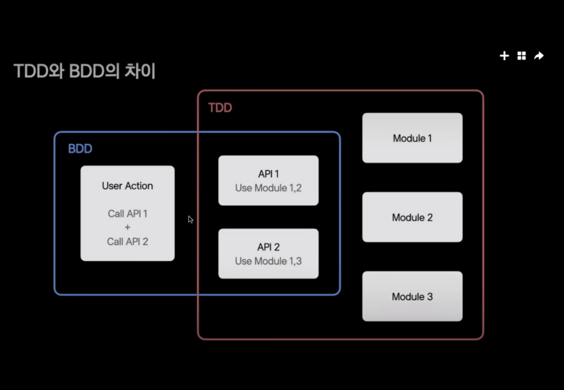 BDD는 TDD의 한 종류로 볼 수 있는데, TDD에서 사용자의 행위란 측면까지 고려하여 테스트를 작성하는 것입니다. 사용자의 행위가 중점이 되는 개발 방법이기 때문에 기능적으로 구현되는 메소드, 모듈의 측면 보다 사용자의 Action을 조금 더 강조하고 있으며, 프론트엔드 개발에 사용되기 적합합니다.