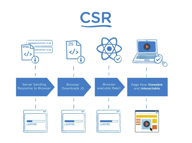 CSR은 Client Side Rendering의 약자로, 웹 페이지의 콘텐츠의 렌더링을 클라이언트 측에서 Javascript 코드가 실행되어 동적으로 렌더링하는 방식입니다. 따라서 최초 로드 시 모든 HTML, CSS, JAVSCRIPT를 한번에 로드한 다음 complie하여 사용하기 때문에 첫 페이지 로드 시간이 SSR보다 상대적으로 길지만, 추가 페이지 로드 시에는 이미 준비된 스크립트를 실행하여 DOM에 즉시 렌더링하는 방식으로 인해 추가 페이지 로드에는 더 효율적입니다. 단점으로는 동적인 웹 페이지 생성으로 인해 검색엔진 데이터 수집이 어려워 SEO에 불리했지만, 최신 검색엔진은 Javascript 크롤링이 가능하여 SEO를 위한 SSR 도입의 필요성이 상대적으로 줄어 들었습니다.