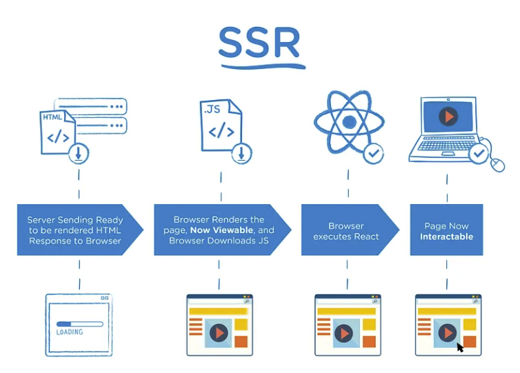 SSR은 Server Side Rendering의 약자로, 웹 페이지의 내용을 서버에서 모두 구성한 뒤 클라이언트로 보내주는 방식입니다. SSR의 특징은 초기 렌더링이 빠르고 SEO (Search Engine Optimization) 최적화에 대한 장점이 있습니다. 대규모 웹 어플리케이션의 초기 렌더링 속도문제를 SSR로 개선할 수 있습니다. 하지만 추가 페이지를 로드할 경우 서버에 Request를 보내는 Cycle을 반복하여 전환 시 화면 깜빡임 문제, 서버 과부하 문제 및 로드 시간이 소요되는 단점이 있습니다.