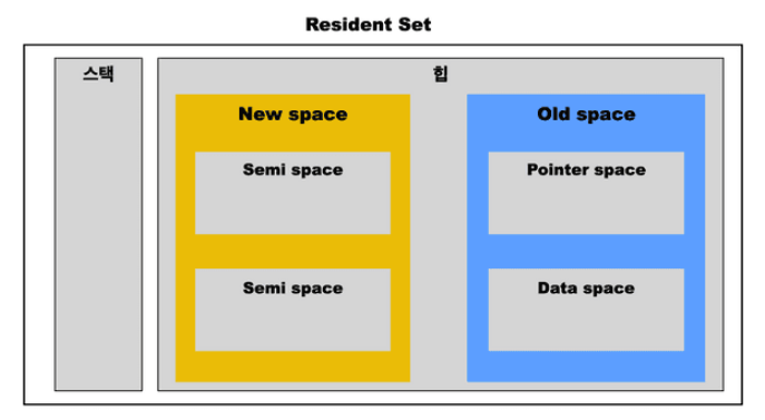 - V8엔진에서는 Resident Set이라는 빈 공간이 할당 됩니다. 자바스크립트는 싱글 스레드이기 때문에 스택 메모리는 1개만을 가집니다. 스택은 함수 호출 종료 시 OS에 의해 정리되지만 힙의 경우 GC에 의해 정리되고 있습니다.