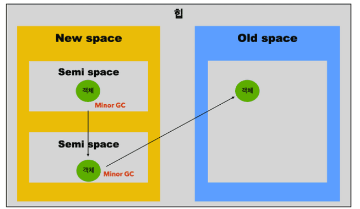 - Minor GC : 두 개의 Semi Space 중 한 곳에서만 신규 Object가 생성되고, 메모리가 꽉 찼을 때 GC 수행 후 살아남은 Object를 다른 Semi Space로 옮긴 뒤 역할을 바뀌게 됩니다. 이후 신규 Object 생성부터 GC 수행 후 저장 공간의 역할을 동일하게 반복합니다. (Default Semi Space Max Size : 64bit cpu - 16Mbyte / 32bit cpu - 8Mbyte )