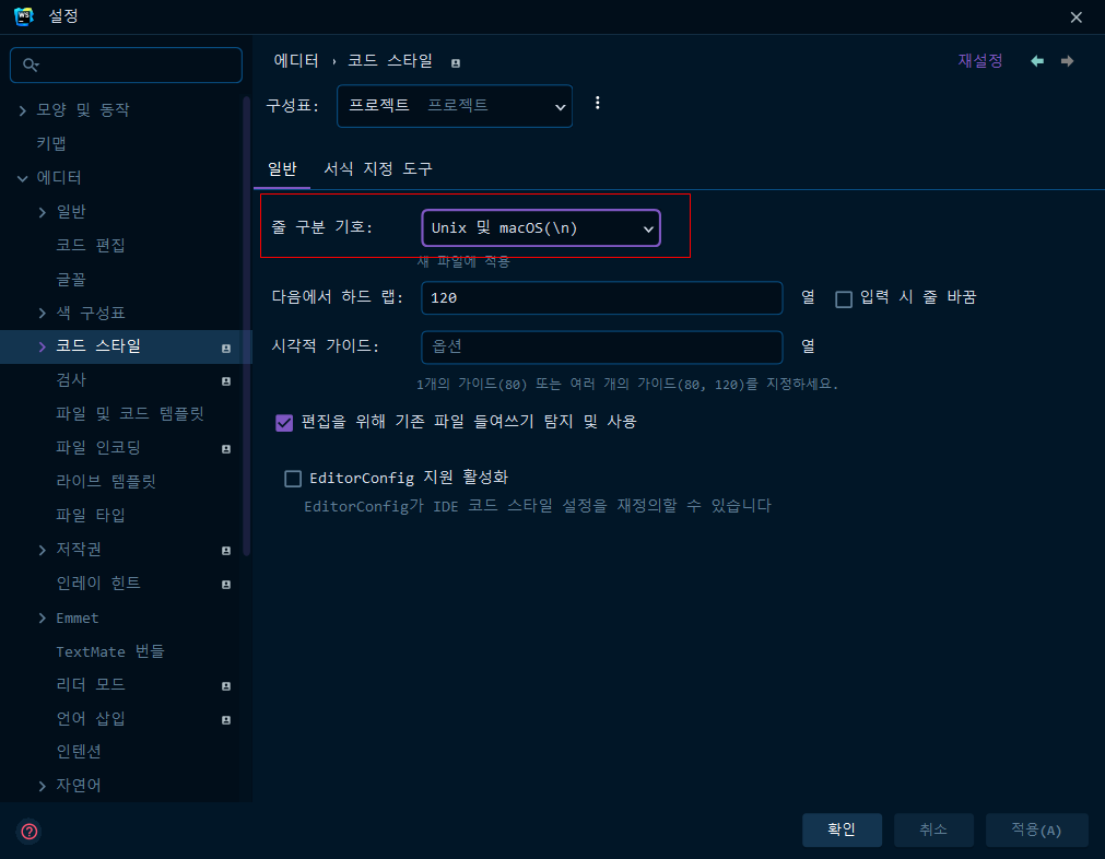 git config --global core.eol lf // mac LF 기준