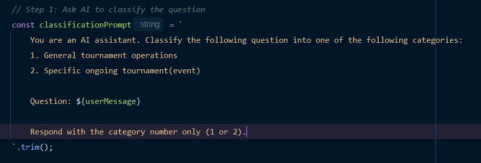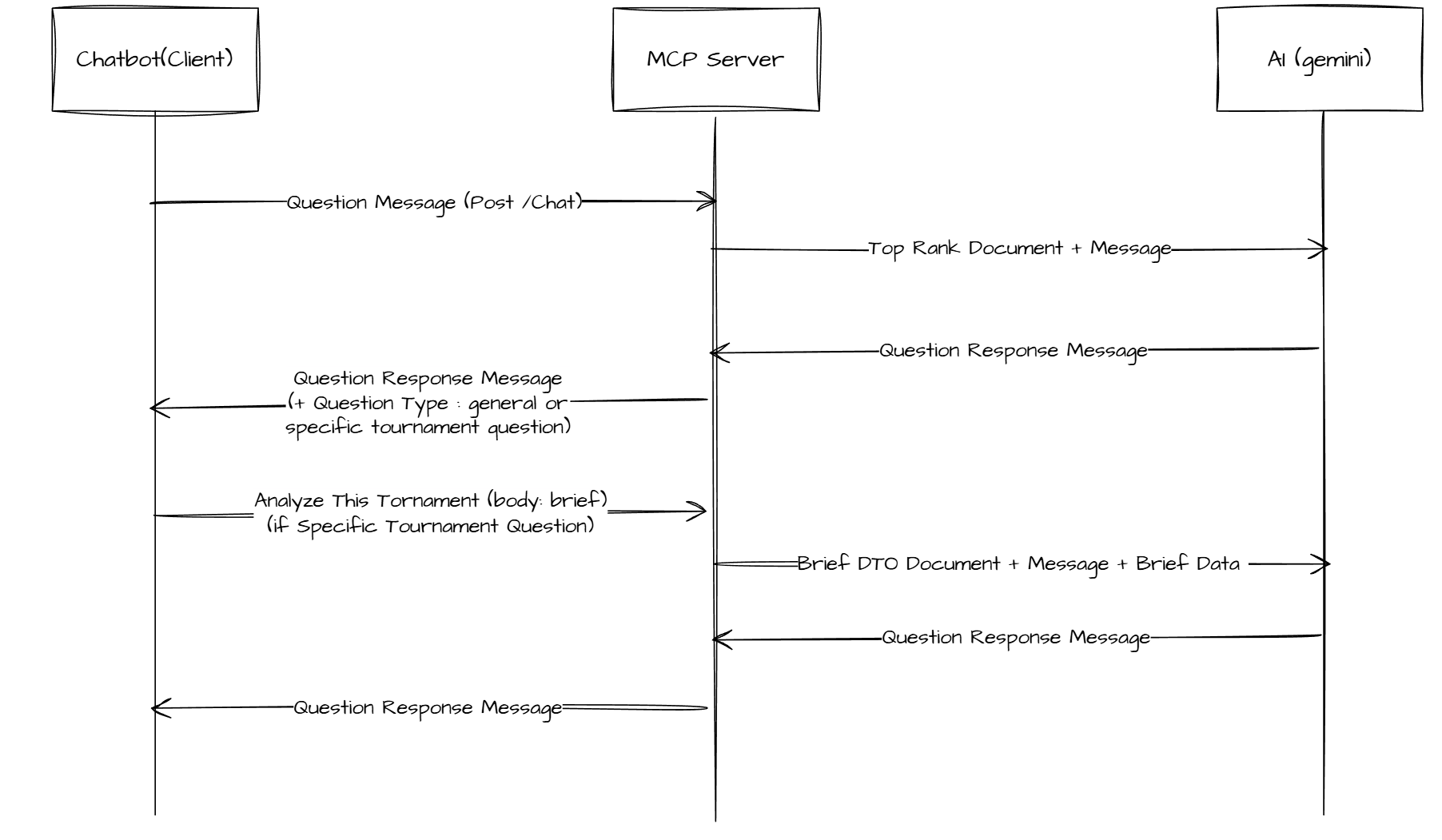 - Chatbot에서 질문을 하면 MCP에서 해당 질문이 일반적인(General) 서비스 관련 질문인지, 아니면 진행 중인 특정 토너먼트(Specific Ongoing Tournament)에 대한 질문인지 판단
